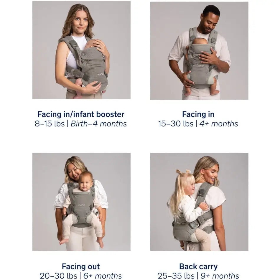 - Four carry positions provide ergonomic positioning as your child grows, for healthy spine and hip development: newborn mode, facing in, facing out, back carry